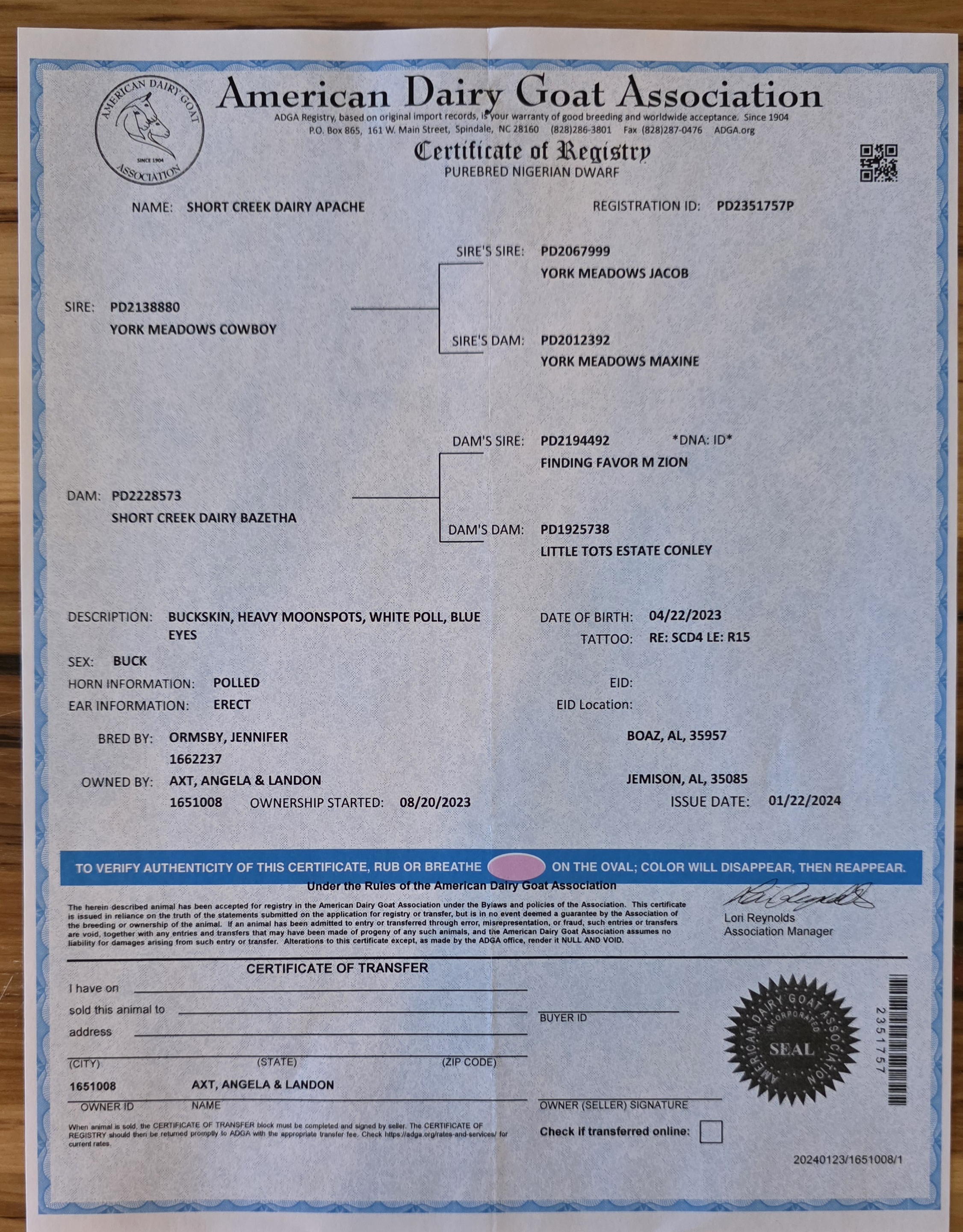 • Sire: SHORT CREEK DAIRY APACHE PD2351757P